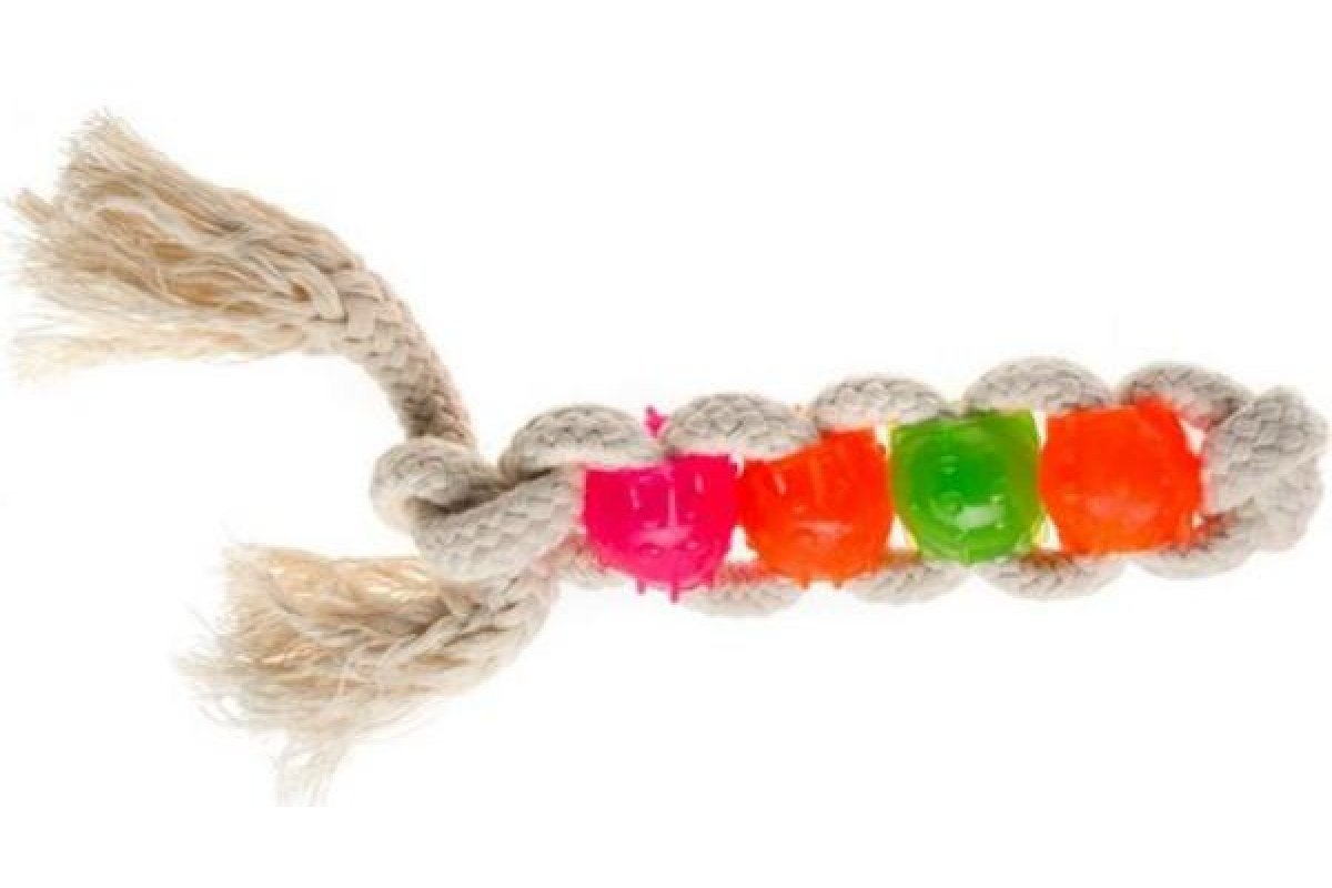 Игрушка состоит из двух частей: красочные элементы и канат из хлопка. Игрушка-канат с элементами для поддержания здоровья зубов и десен собак.
