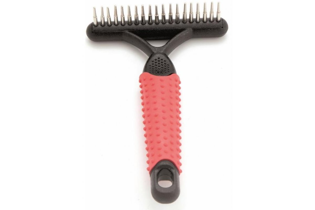 Специальная форма зубьев благодаря утолщению у основания вычесывает как шерсть, так и подшерсток. При этом расческа не повреждает поверхность кожи и не травмирует структуру шерсти.