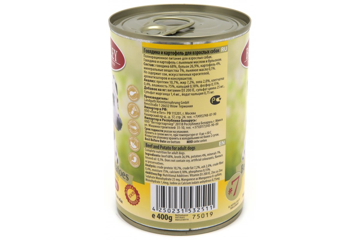 Полнорационное консервированное питание для собак. Говядина с картофелем, льняным маслом и ароматным бульоном.