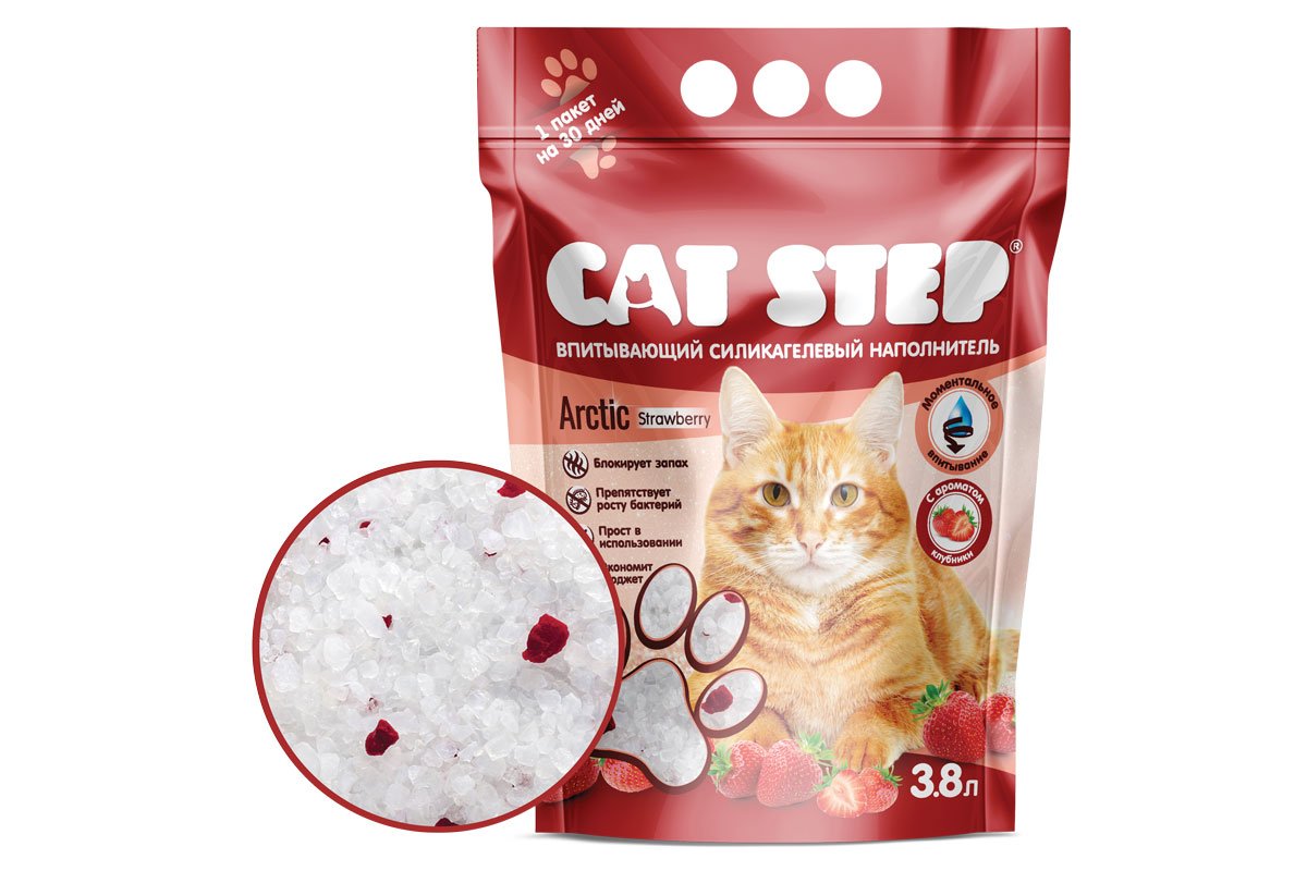Cat Step Клубника 3,8 л - это силикагелевый наполнитель, который моментально впитывает жидкости и уничтожает неприятные запахи. Гранулы не налипают на лапы, не пылят и не вызывают аллергии.
