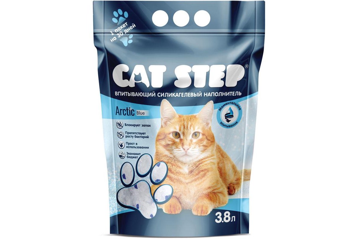 Cat Step Силикагелевый - это силикагелевый наполнитель, который моментально впитывает жидкости и уничтожает неприятные запахи. Гранулы не налипают на лапы, не пылят и не вызывают аллергии.