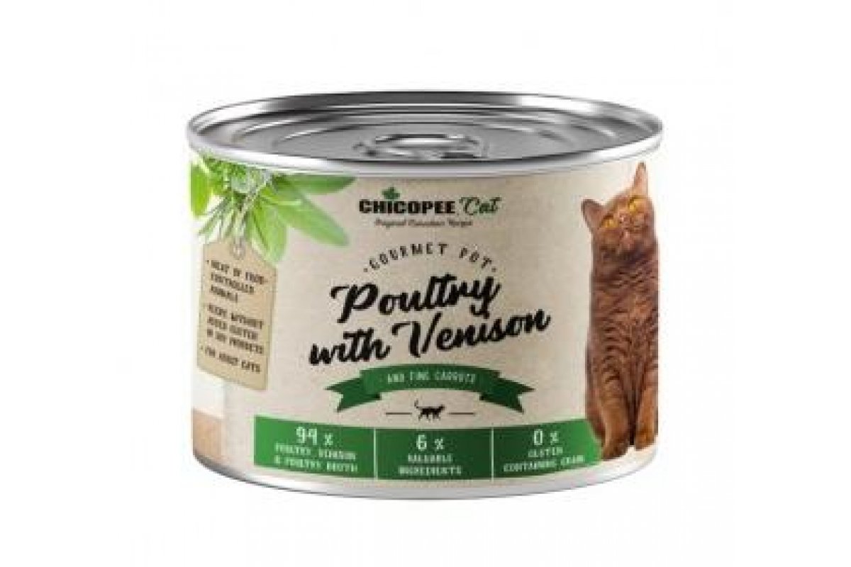 Chicopee Adult Cat (Паштет с домашней птицей и олениной) - с мясной составляющей до 90% (мясо, субпродукты, а также мясной бульон) и обогащенные, множеством натуральных и ценных ингредиентов животного и растительного происхождения.