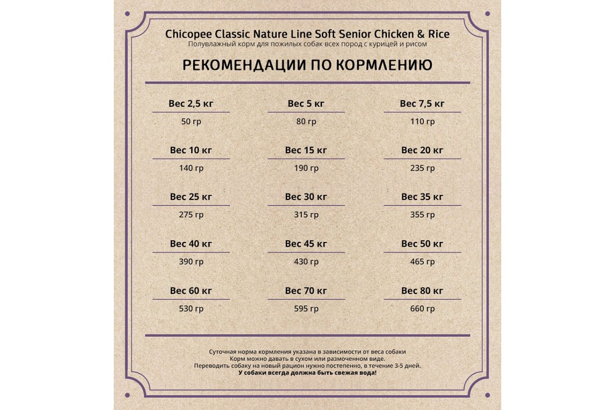 Суточная норма кормления указана в зависимости от веса собаки. Корм можно давать в сухом или размоченном виде. Переводить собаку на новый рацион нужно постепенно, в течении 3-5 дней. У собаки всегда должна быть свежая вода!
