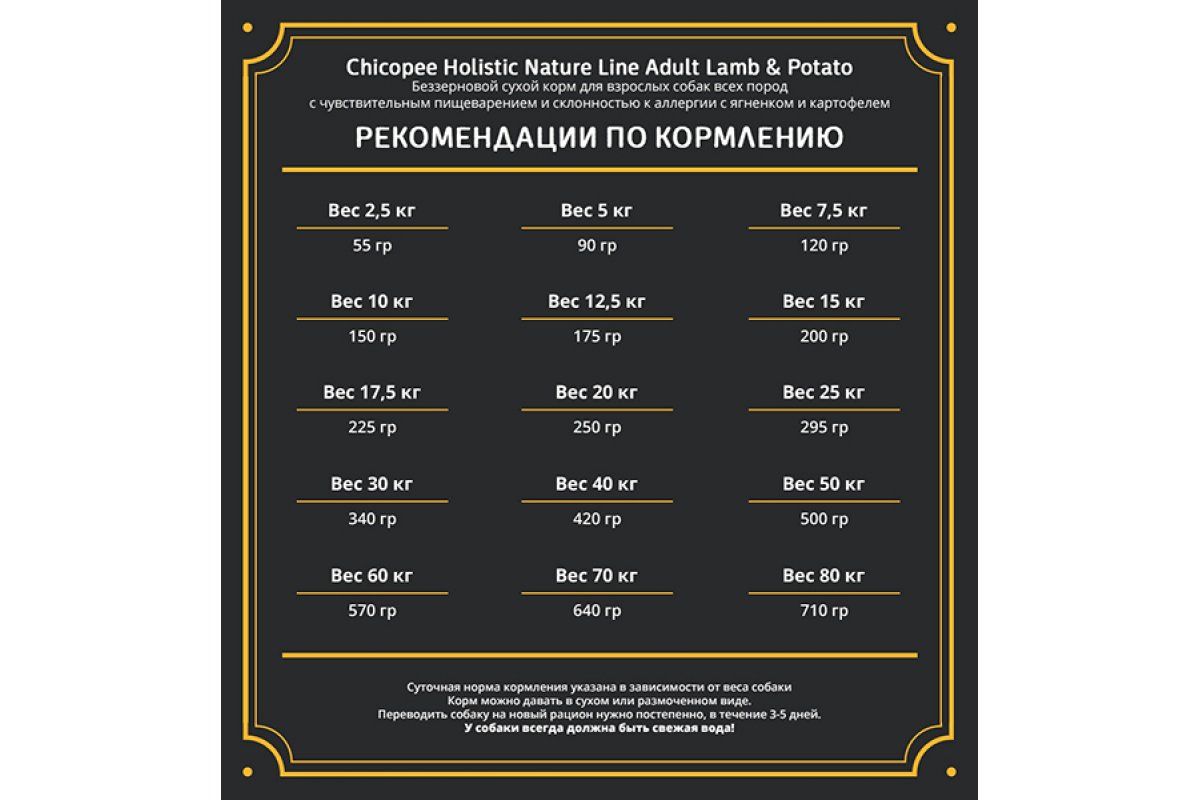 Суточная норма кормления указана в зависимости от веса собаки. Корм можно давать в сухом или размоченном виде. Переводить собаку на новый рацион нужно постепенно, в течении 3-5 дней. У собаки всегда должна быть свежая вода!