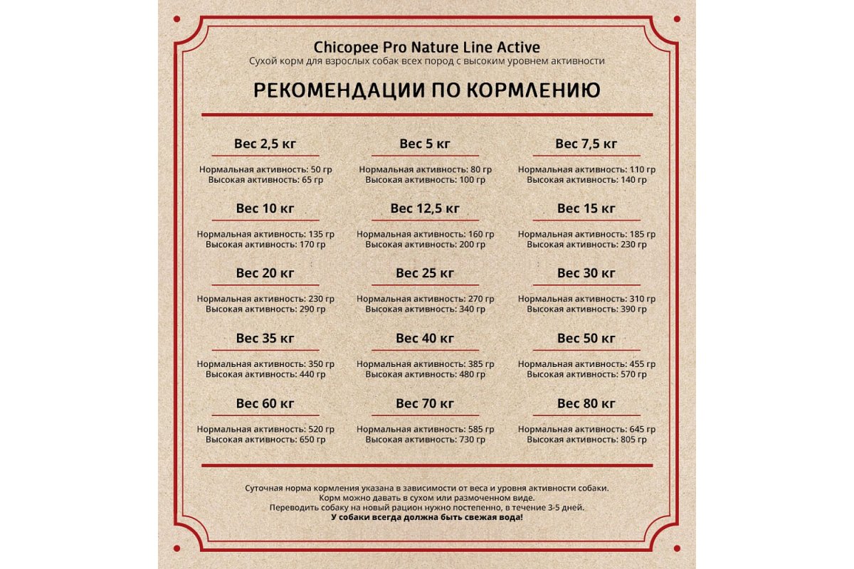 Суточная норма кормления указана в зависимости от веса и уровня активности собаки. Корм можно давать в сухом или размоченном виде. Переводить собаку на новый рацион нужно постепенно, в течении 3-5 дней. У собаки всегда должна быть свежая вода!