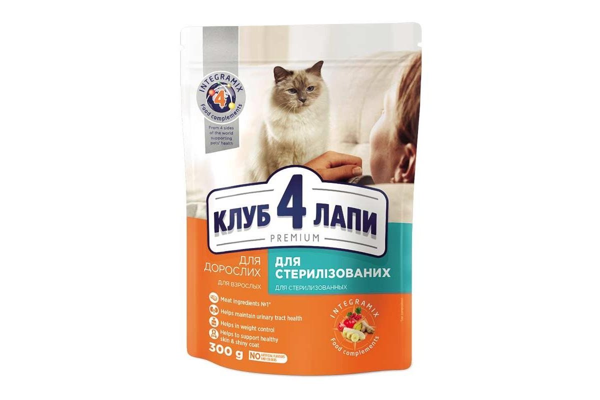 Порция корма должна быть комнатной температуры. Корм необходимо вводить в рацион постепенно (по крайней мере в течение первых 5-ти d (дней)). Обеспечить животному постоянный доступ к чистой свежей питьевой воды. Индивидуальные нормы кормления могут меняться в зависимости от возраста, породы, уровня активности и среды обитания животного. Комбинируйте кормления с сухим рационом CLUB 4 PAWS Премиум "Стерилизованные". Полнорационные сухой корм для взрослых стерилизованных кошек.