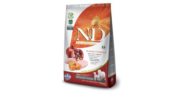 Для средних и крупных пород, беззерновой, тыква, курица, гранат.