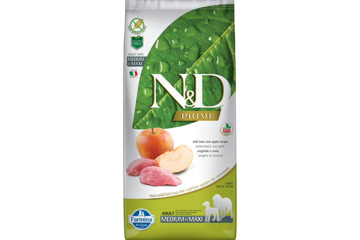 Farmina N&D GF Prime Adult Medium & Maxi (Кабан и яблоко) - полнорационный беззерновой корм для взрослых собак.