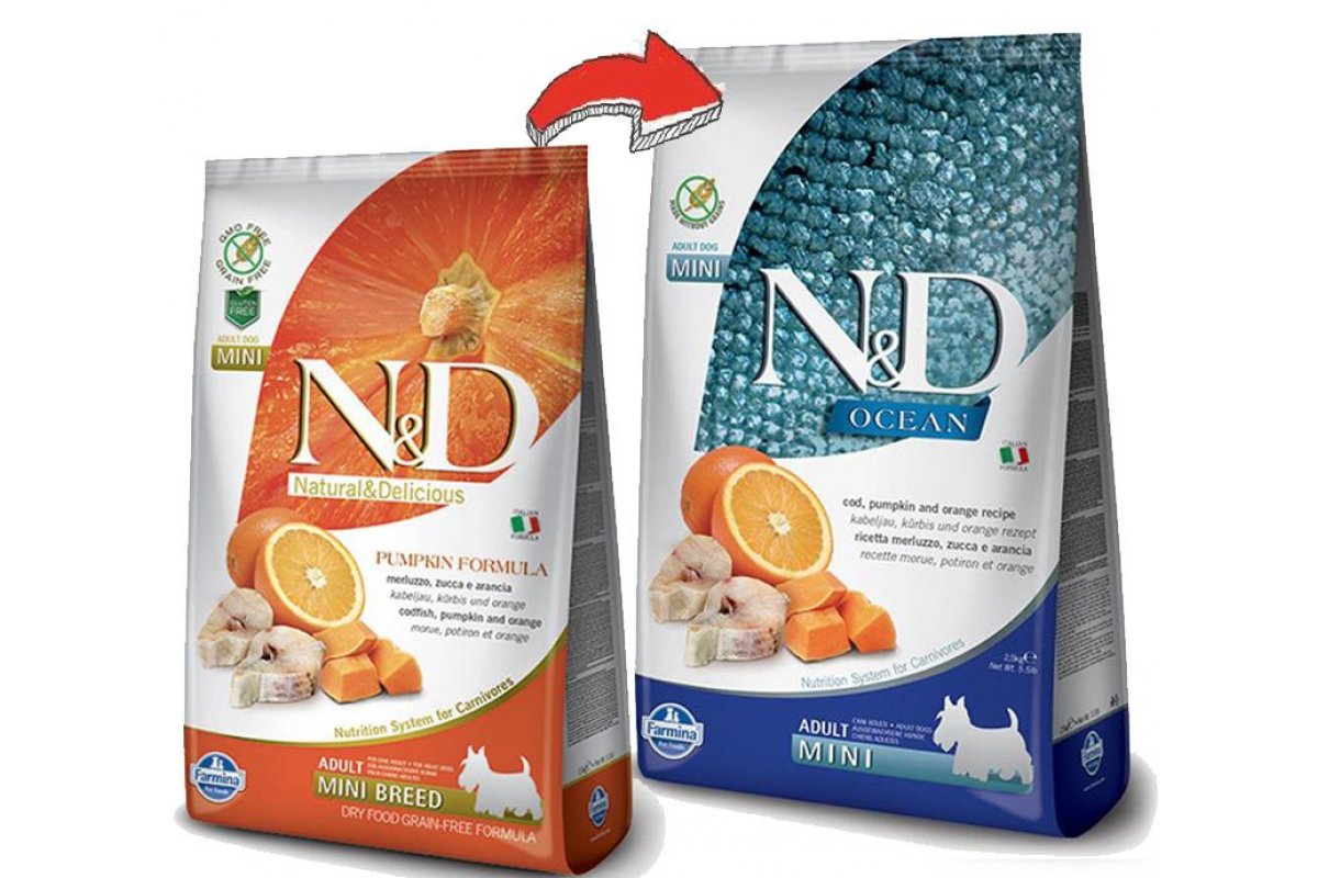 Farmina N&D GF Pumpkin Ocean Adult Mini (Тыква, треска, апельсин) - это беззерновой корм с тыквой, треской и апельсином для взрослых собак мелких пород.