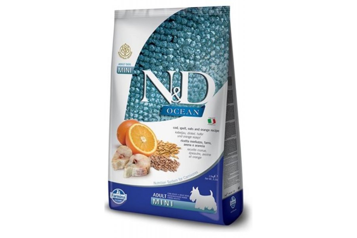 Farmina N&D LG Ocean Adult Mini (Треска, апельсин, спельта, овес) - это низкозерновой корм с треской, апельсином, спельтой и овсом для взрослых собак мелких пород.