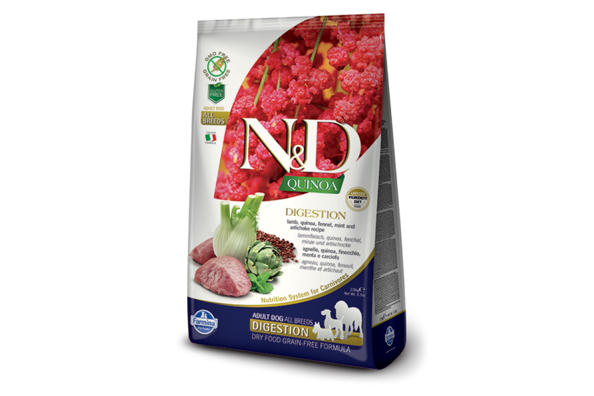 Farmina N&D Quinoa Adult All Breeds Digestion (Ягненок, киноа, фенхель, мята) - беззерновой корм для взрослых собак, приготовленный на основе нежного мяса ягненка с добавлением фенхеля, мяты, киноа, артишока и других полезных для здоровья ингредиентов. Он регулирует пищеварительные процессы и хорошо усваивается организмом животных.