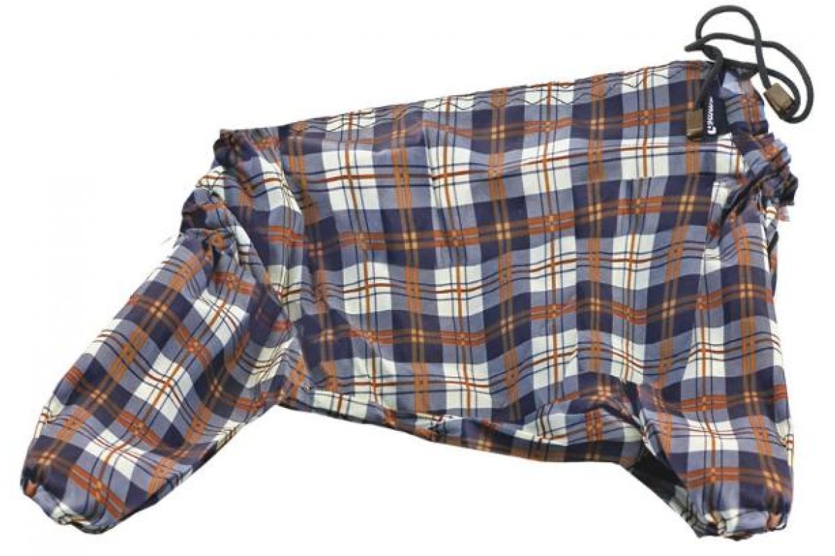 Изделие надежно фиксируется при помощи липучки на спине, ширина горловины регулируется при помощи завязки, а на штанинах предусмотрены удобные резинки, препятствующие попаданию грязи и влаги снизу.