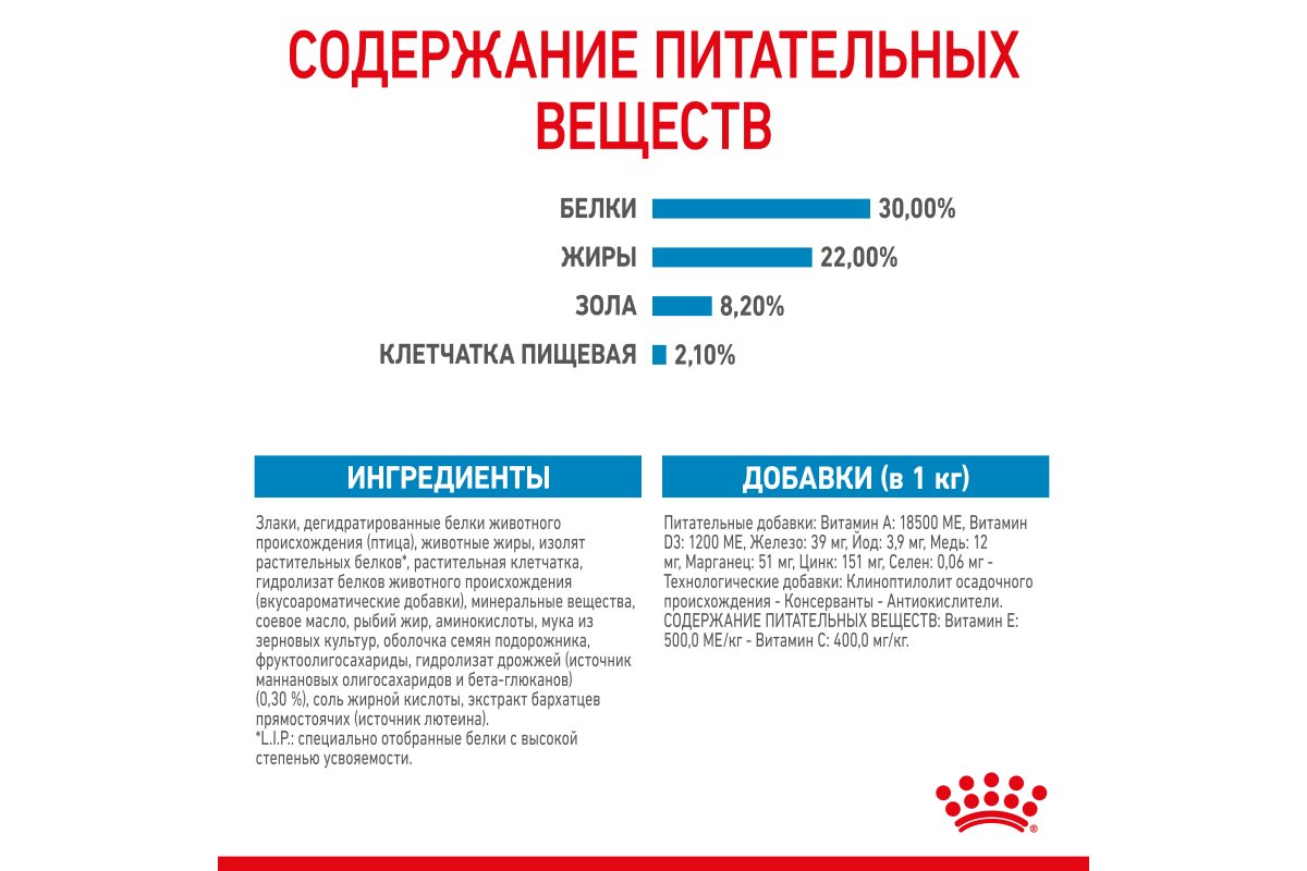 злаки, дегидратированные белки животного происхождения, животные жиры, изолят растительных белков*, растительная клетчатка, гидролизат белков животного происхождения (вкусоароматические добавки), минеральные вещества, соевое масло, рыбий жир, аминокислоты, мука из зерновых культур, оболочкa семян подорожника, фруктоолигосахариды, гидролизат дрожжей (источник мaннановых олигосахаридов и бета-глюканов) (0,30 %), соль жирной кислоты, экстракт бархатцев прямостоячих (источник лютеина).