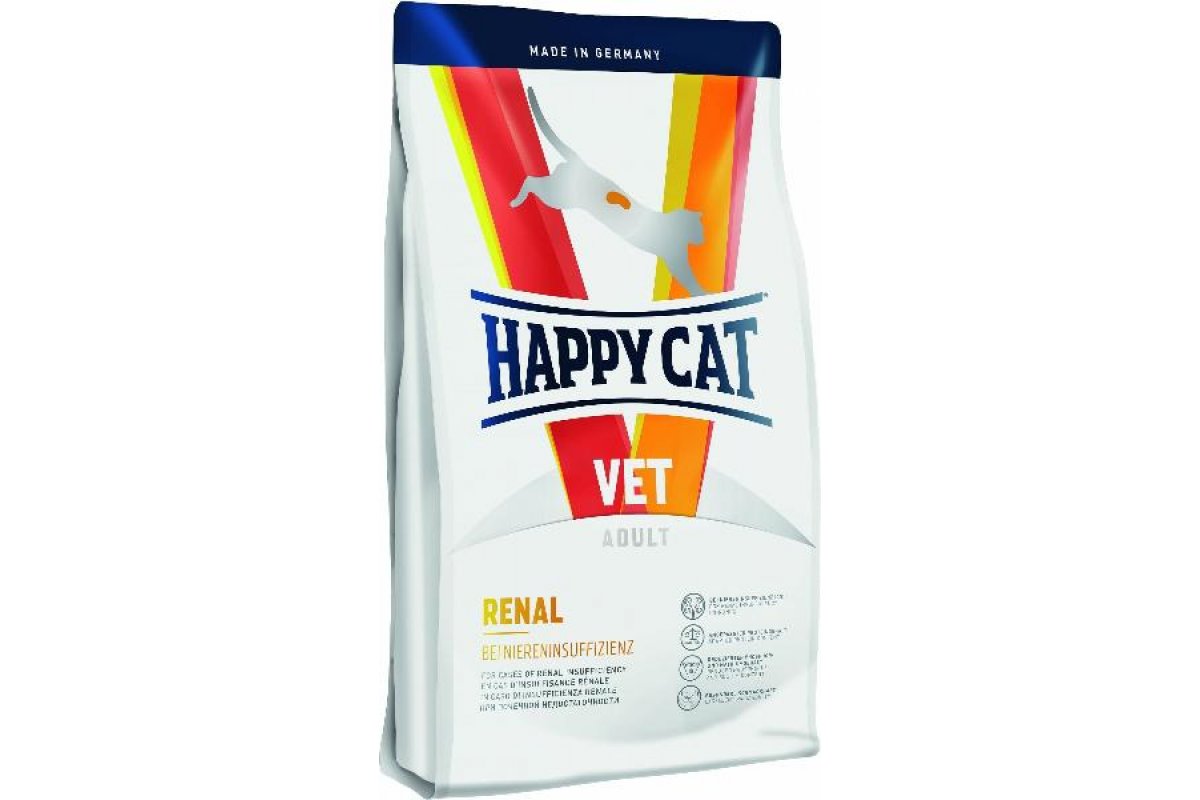 Happy Cat VET Diet Renal - корм для кошек с хронической почечной недостаточностью, гипертензией, нефритом. Сниженное содержание фосфора, натрия и протеина в соответствии с минимальными потребностями. Стимуляция аппетита за счет повышенной вкусовой привлекательности.