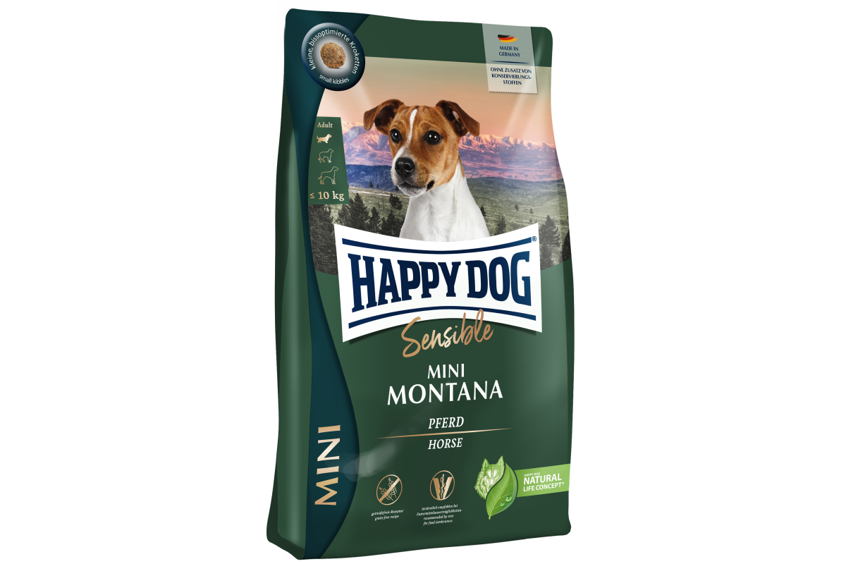 Хэппи Дог Мини Монтана- это беззерновой сухой корм с кониной для собак мелких пород с чувствительным пищеварением