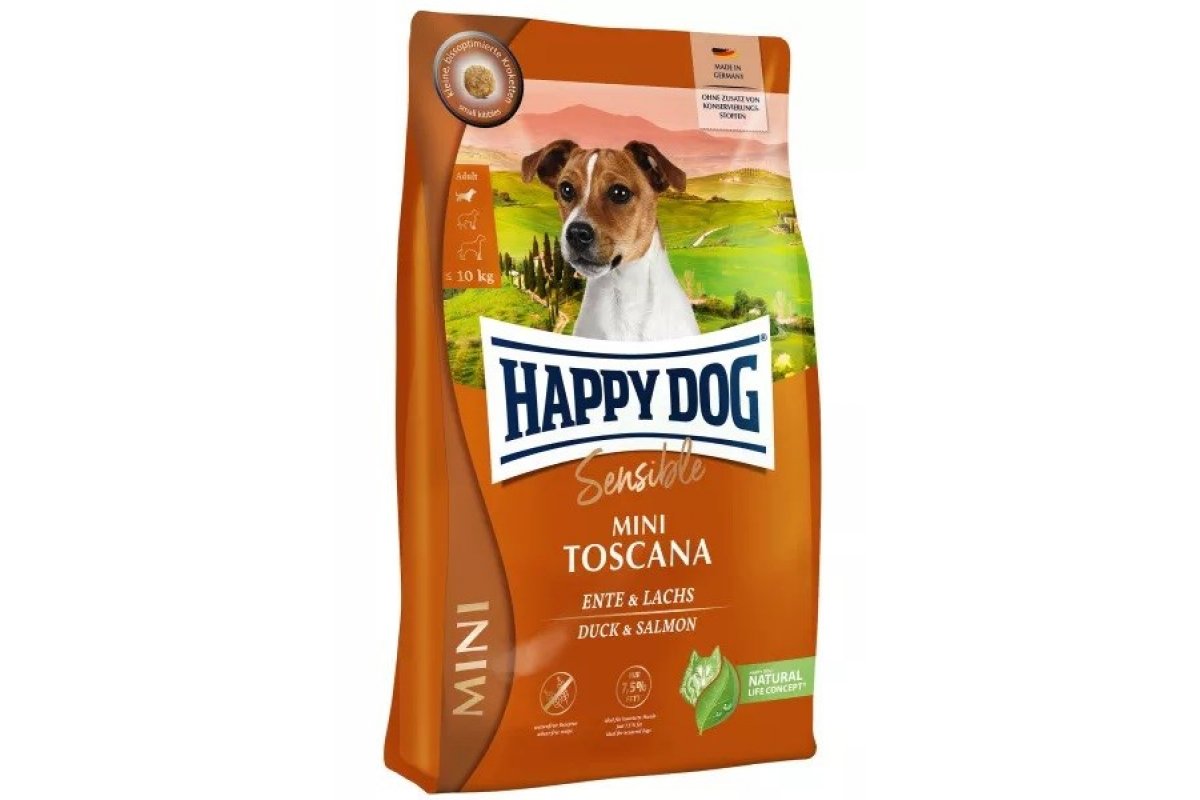 Хэппи Дог Мини Тоскана- это  безглютеновый сухой корм с лососем и уткой по-средиземноморски