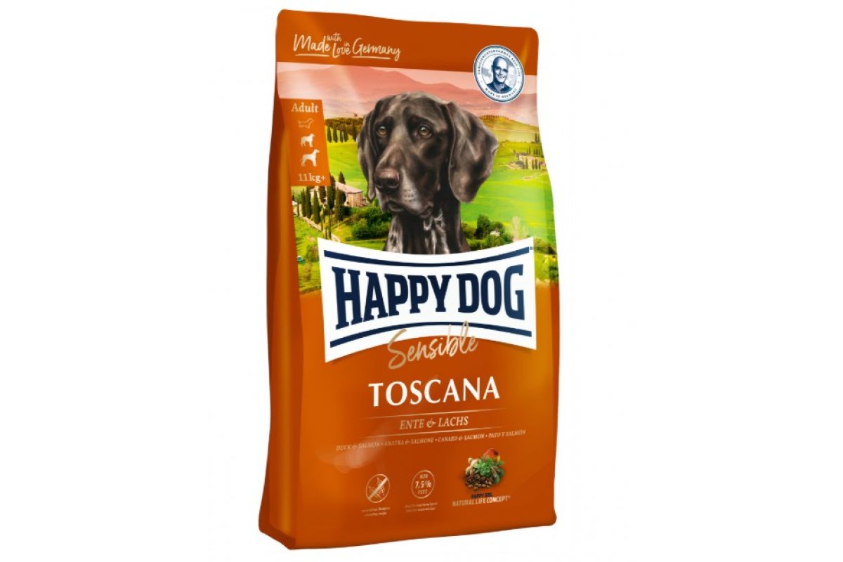Happy Dog Sensible Toscana – это полнорационный корм без глютена с лососем и вкусной уткой в средиземноморском стиле