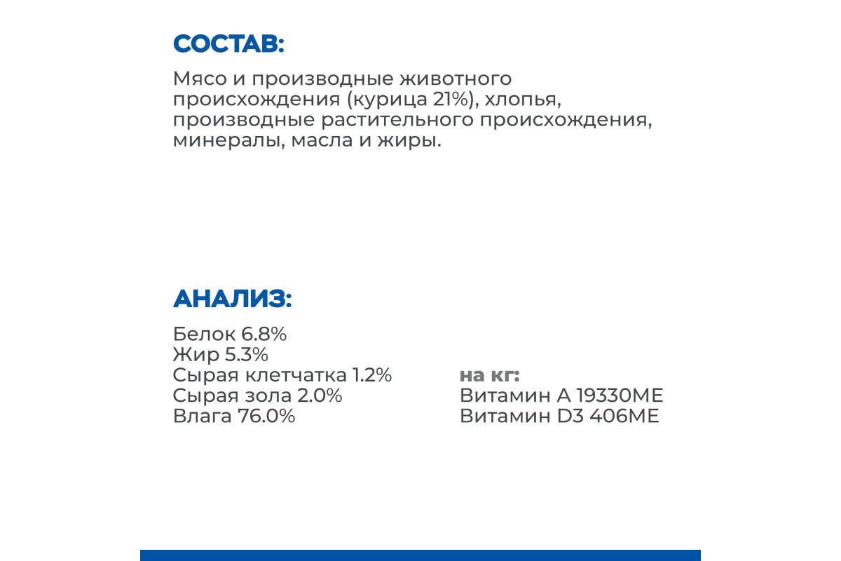Состав: Мясо и производные животного происхождения (курица 21%), злаки, производные растительного происхождения, минералы, масла и жиры.