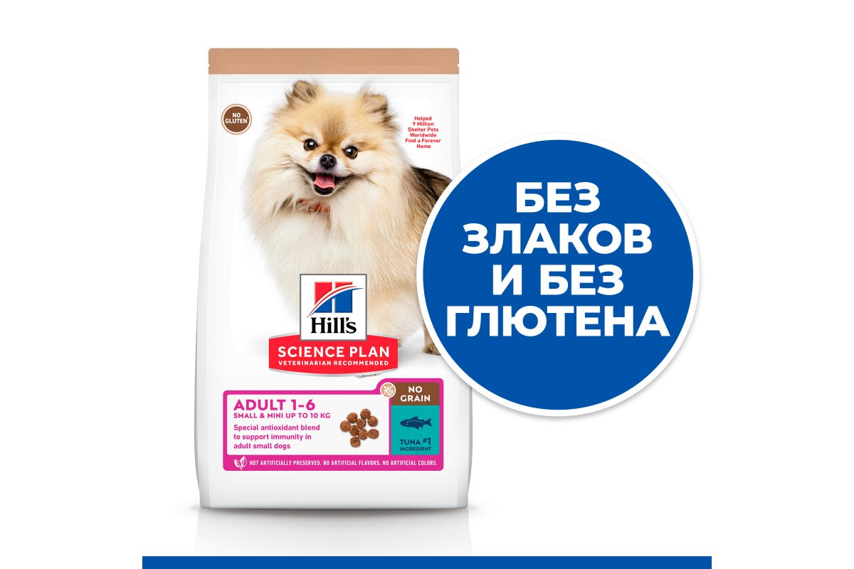 Сухой корм для собак Hill's Science Plan No Grain для мелких пород с тунцом - корм для собак Small & Mini Adult с тунцом разработан специально для удовлетворения уникальных потребностей собак Small & Mini в расцвете сил. Специально приготовлено из мельчайших кусочков.