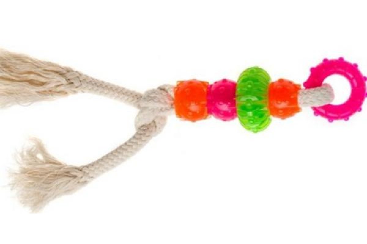 Игрушка состоит из двух частей: красочные элементы и канат из хлопка. Игрушка-канат с элементами для поддержания здоровья зубов и десен собак.