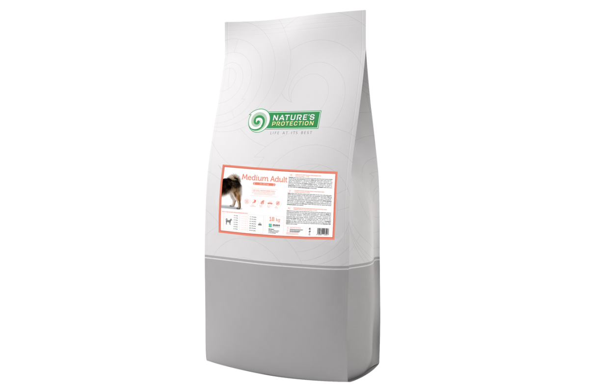 Nature's Protection Adult Medium корм для взрослых собак средних пород. Вес взрослой собаки: 11-25 кгMedium Adult сухой корм Супер-премум класса для взрослых собак средних пород весом 11–25 кг является 100% полноценным и сбалансированным питанием: