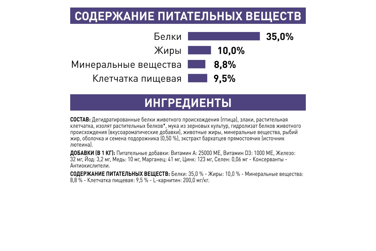 Состав: дегидратированные белки животного происхождения (птица), кукуруза, растительная клетчатка, пшеница, кукурузная клейковина, пшеничная клейковина*, гидролизат белков животного происхождения, животные жиры, минеральные вещества, экстракт цикория, оболочка и семена подорожника, рыбий жир, экстракт бархатцев прямостоячих (источник лютеина). .