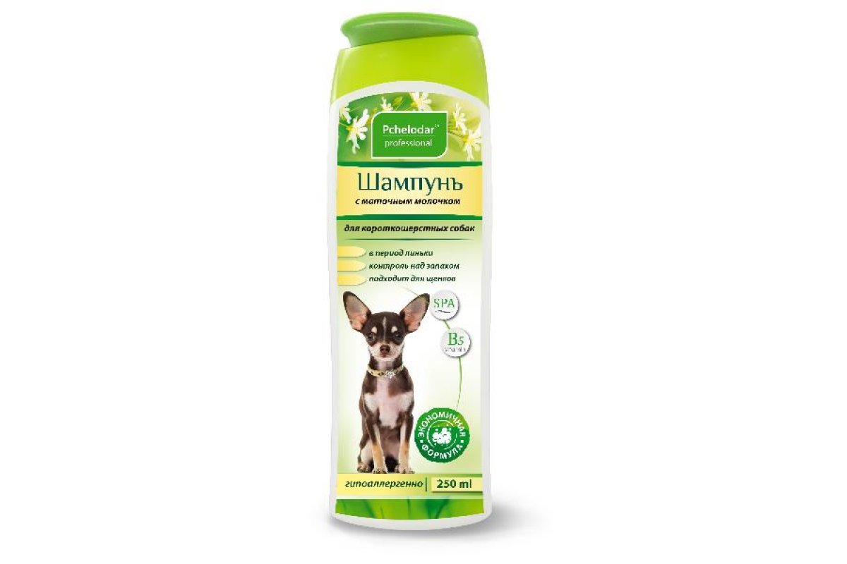 Pchelodar Шампунь с маточным молочком для короткошерстных собак (250 мл) нежно ухаживает за кожей и шерстью, имеет антисептическое, дезодорирующее, ранозаживляющее и противозудное действие.