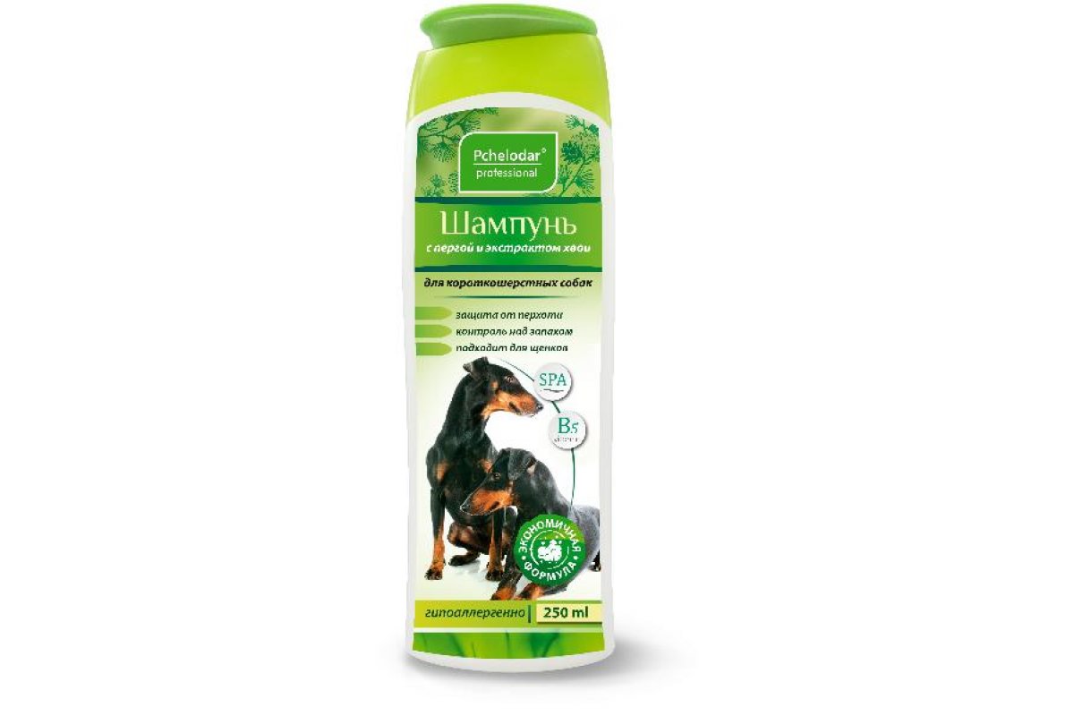 Pchelodar Шампунь с пергой и хвоей для короткошерстных собак (250 мл) нежно ухаживает за кожей и шерстью, имеет антисептическое, успокаивающее и увлажняющее действие.