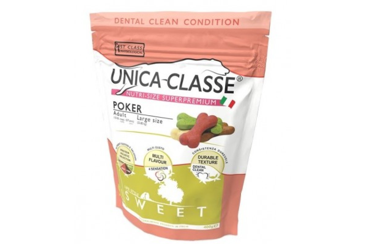Unica Classe Poker Sweet — физиологическая закуска для взрослых собак (от 15/18 месяцев до 5/7 лет) больших и гигантских размеров, весом от 25 до 80 кг.