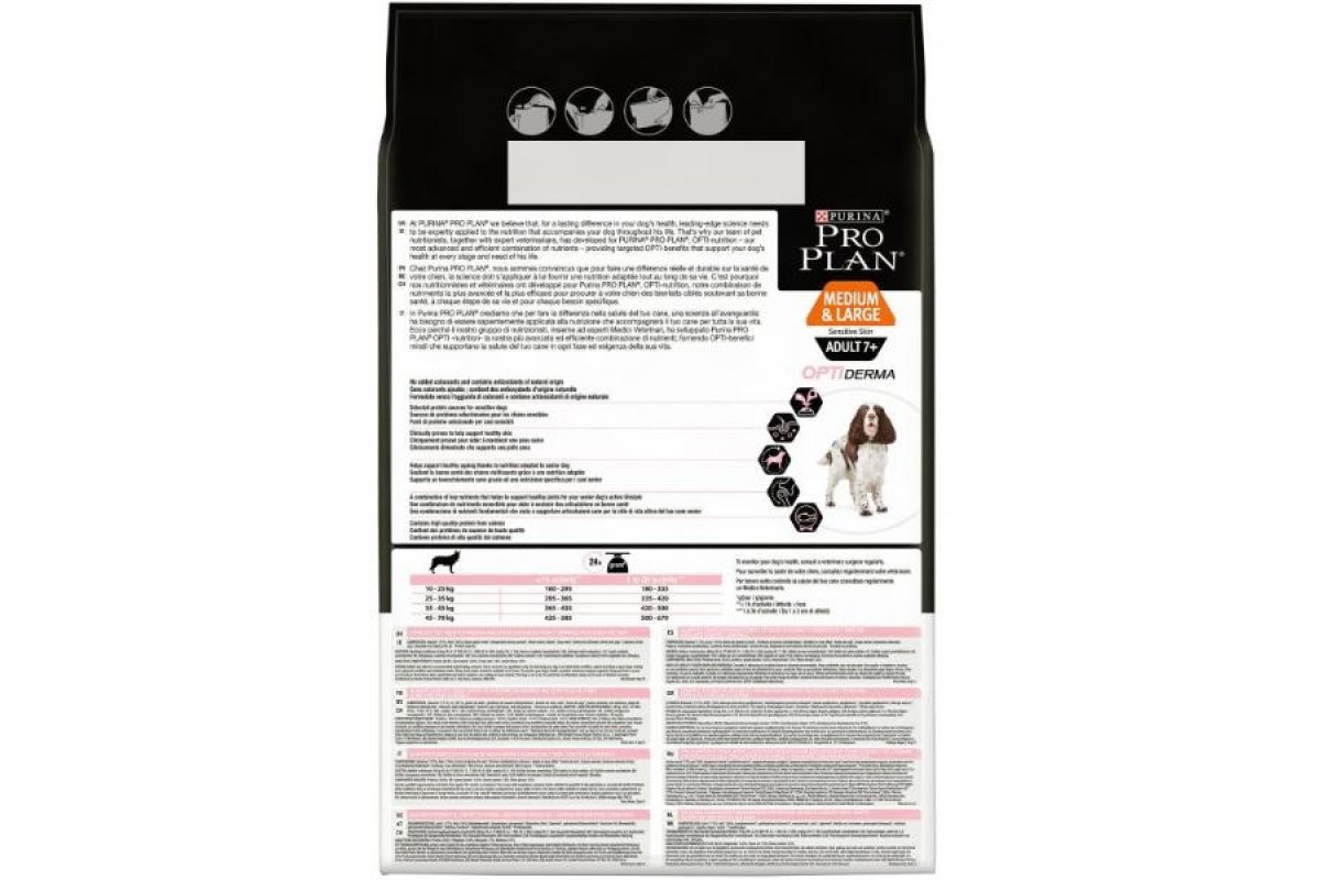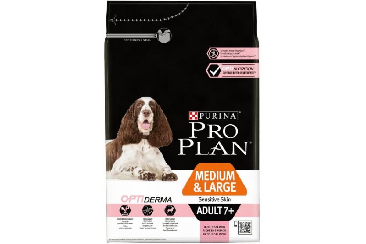 Pro Plan Adult 7+ Medium&Large Opti Derna - это корм сухой полнорационный для взрослых собак старше 7 лет средних и крупных пород с чувствительной кожей с комплексом OPTIDERMA®, с лососем и рисом.