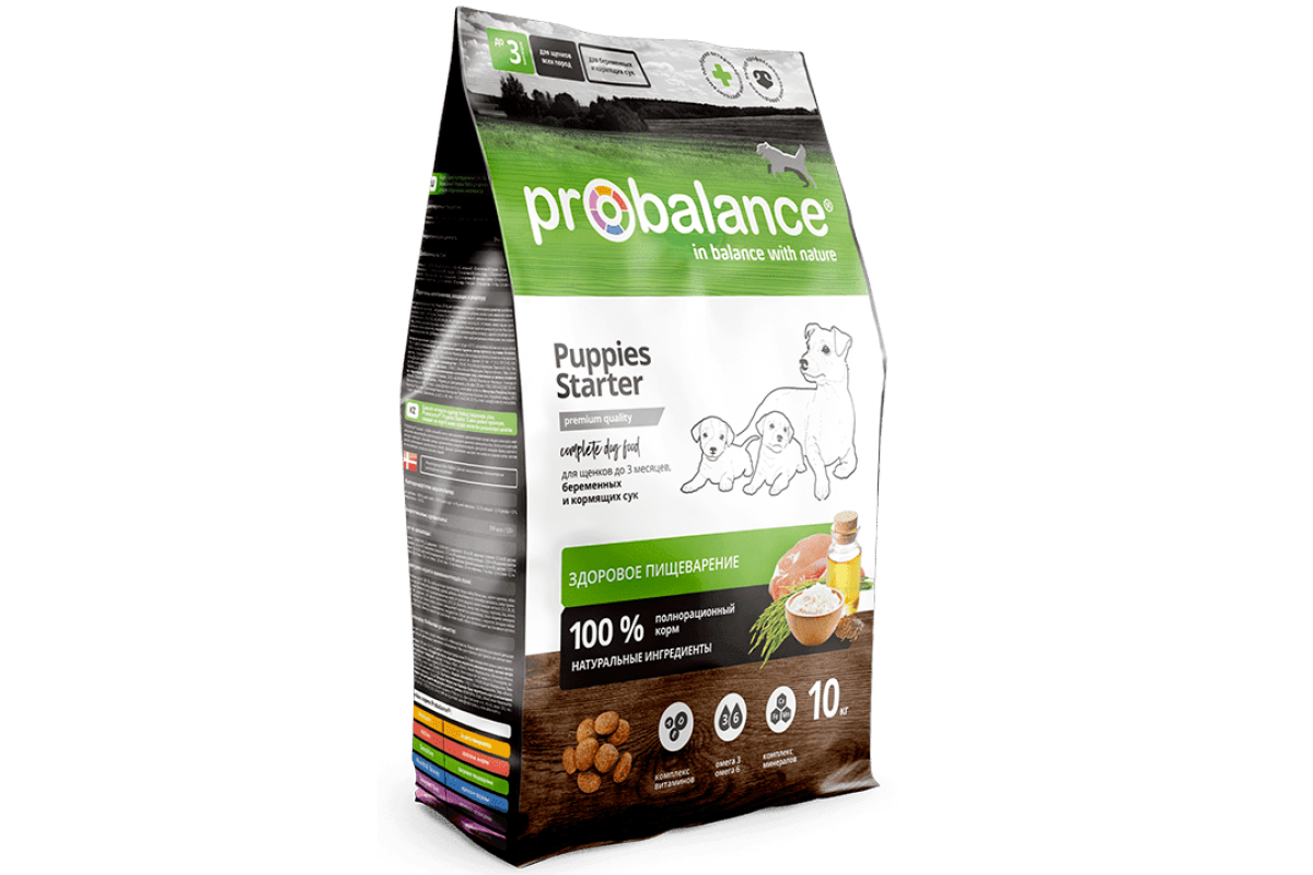 Сухой корм для щенков от 1 до 3 месяцев. Большое количество белка, витаминов и минералов обеспечивают полноценный рост и развитие организма щенка. Несколько источников клетчатки помогают пищеварению и стабилизируют стул. Природные антиоксиданты, лизин и пребиотик содержащиеся в гранулах, способствуют укреплению иммунитета молодого организма. ProBalance Starter не содержит искусственных ароматизаторов и красителей.
