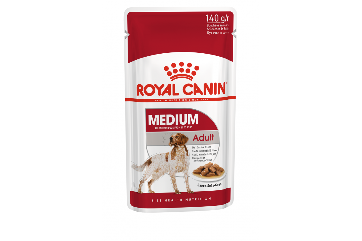 Royal Canin Adult Medium (в соусе) - полнорационный корм для взрослых собак средних размеров (весом от 10 до 25 кг) в возрасте от 12 месяцев до 10 лет.
