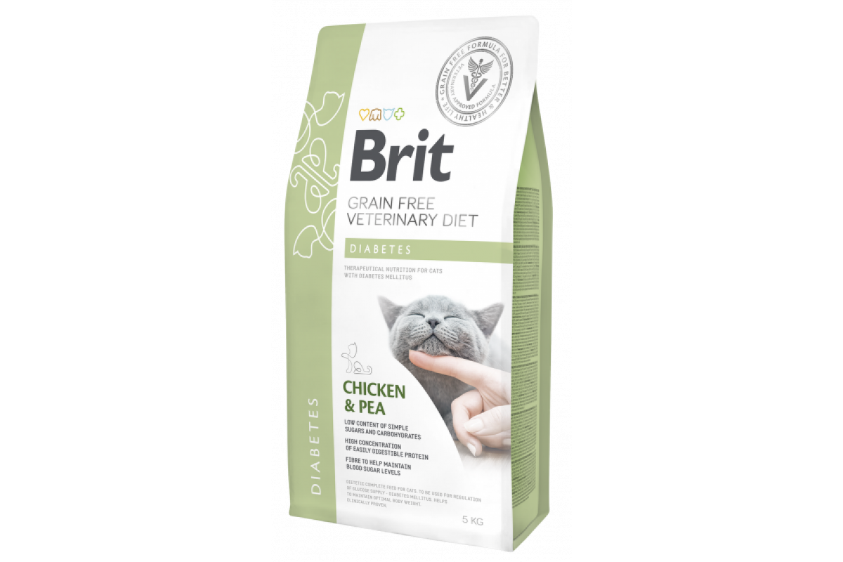 Сухой беззерновой лечебный корм Brit VD Cat Grain free Diabetes для кошек с сахарным диабетом. Назначение диеты: коррекция уровня сахара в крови. Полноценный легко усваиваемый диетический корм с низким гликемическим индексом для оптимального контроля постпрандиальной гликемии у котов, которые лечатся от диабета.