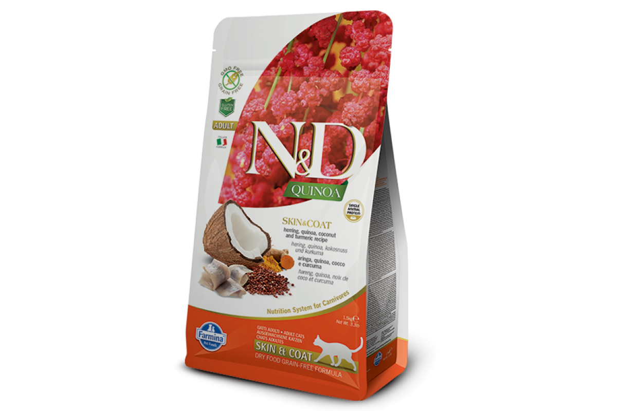 Farmina N&D Cat Quinoa Skin & Coat Herring & Coconut - беззерновой корм для взрослых кошек, заботящийся о здоровье кожи и шерсти. В состав входит свежая дикая сельдь, добавлены куркума, кокос, киноа, а также другие полезные для здоровья компоненты.