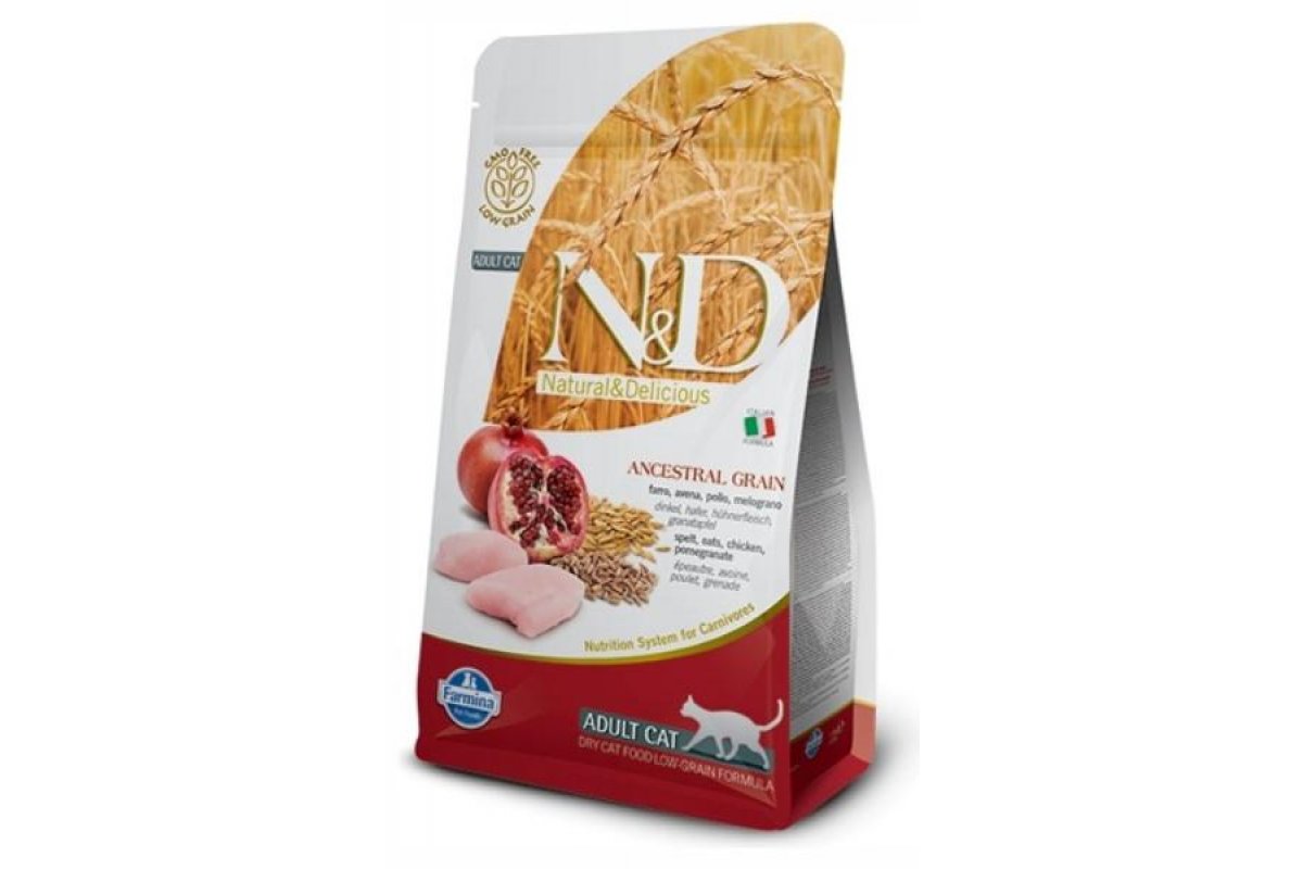 Farmina N&D LG Cat Chicken & Pomegranate (Курица, гранат, спельта, овес) - полнорационный корм с низким содержанием зерна для взрослых кошек.