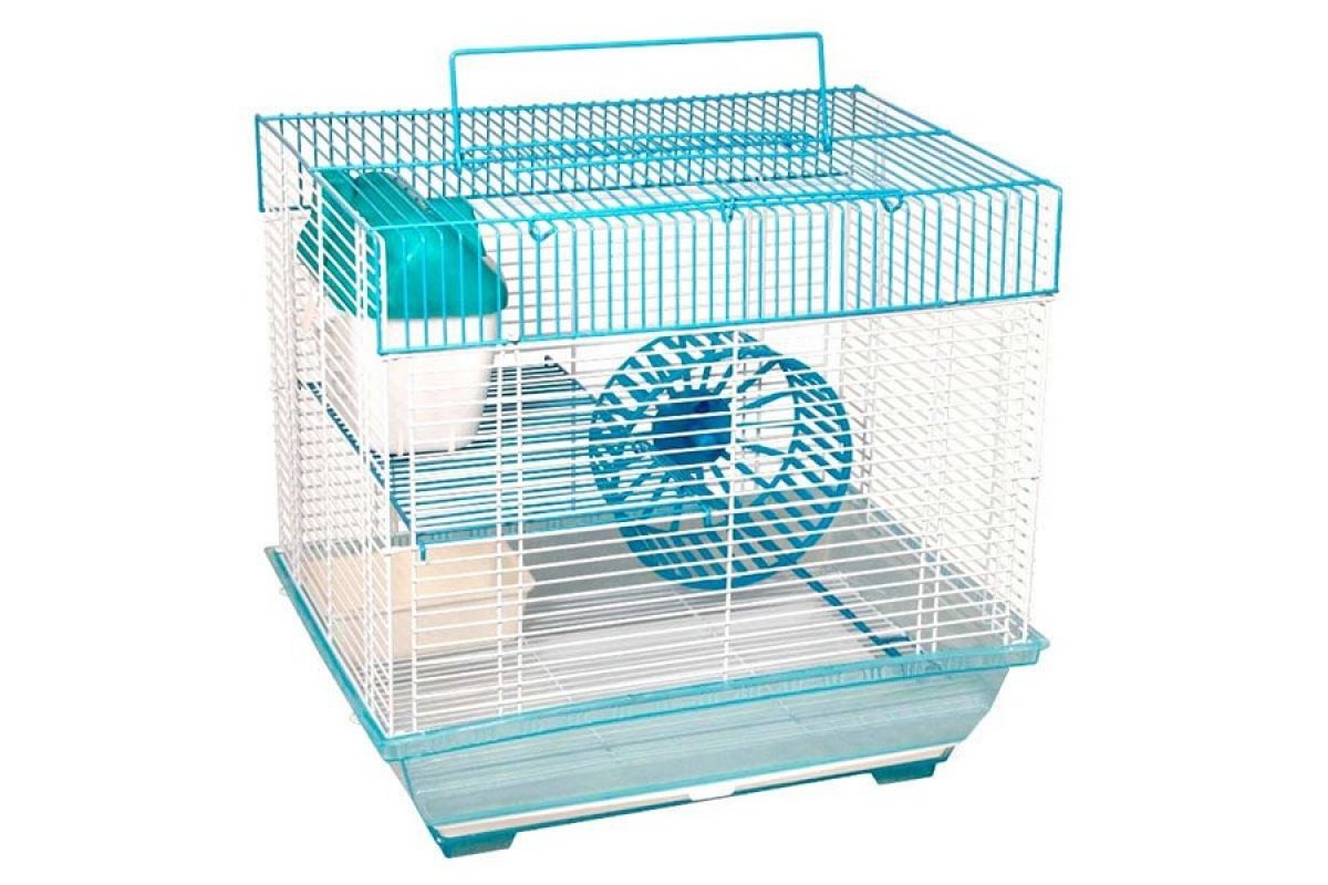 В комплект клетки входят пластиковая миска, колесо, домик, металлическая полочка и металлическая лесенка.