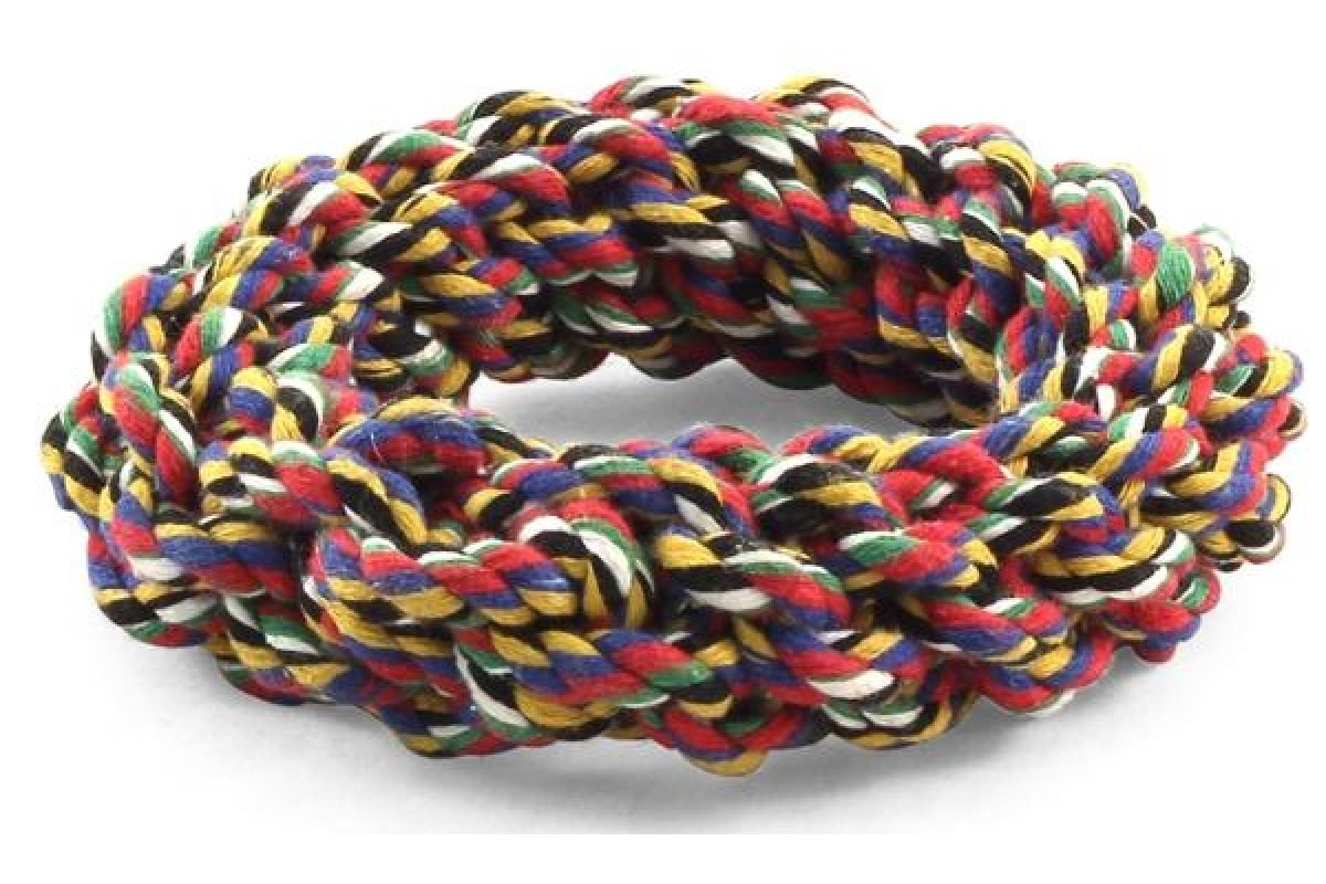Плетеное кольцо сделано из разноцветных веревок из натурального хлопка, очень прочная игрушка.