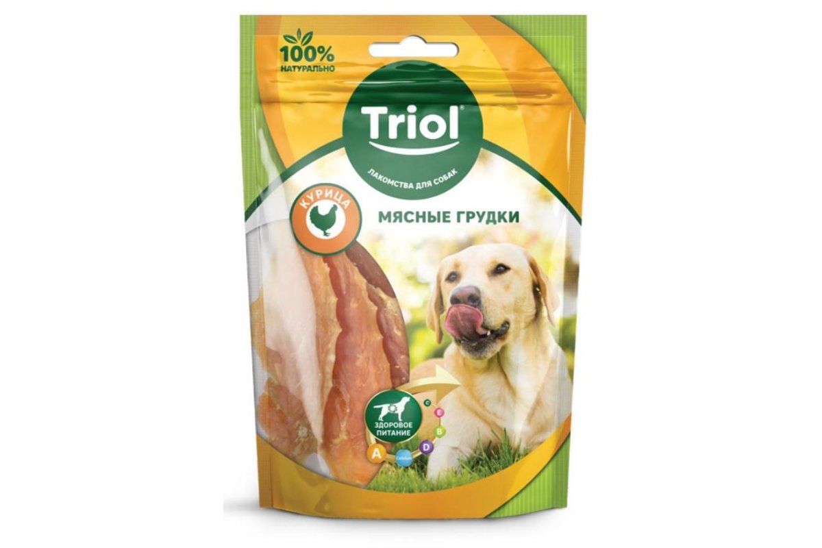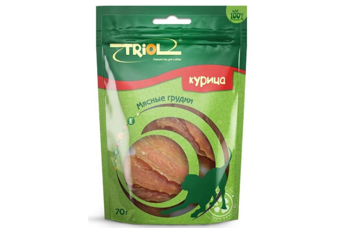 Triol PT26 Мясные грудки из курицы, 70 г - это аппетитное лакомство для собак, заботящееся о зрении, коже и шерсти.