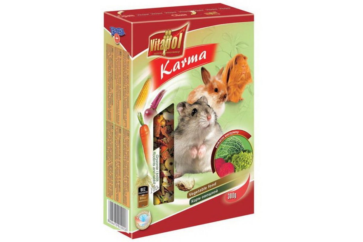Karma - это вкусная серия кормов, разработанная фирмой Vitapol специально для грызунов. Корм включает в себя большое разнообразие продуктов, которые отлично поддержат организм вашего грызуна.Смесь овощей и зерновых обогатят организм витаминами и нужными минералами. Морковь, сельдерей, бобы и другие овощи - это все очень любят грызуны и едят с удовольствием. За счет минералов и сельдерея снизится уровень холестерина сердечно-сосудистая система станет работать лучше, а также снизится уровень сахара, что важно для грызунов с повышенно массой тела.